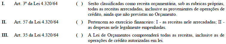 O orçamento é um importante instrumento de planejamento de qualquer entidade, seja pública ou privada, e representa o fluxo previsto de ingressos e de aplicações de recursos em determinado período. A matéria pertinente à receita vem disciplinada no art. 3º, conjugado com o art. 57 e no art. 35 da Lei nº 4.320/1964. Com base no conteúdo dos referidos artigos, relacione as colunas abaixo: