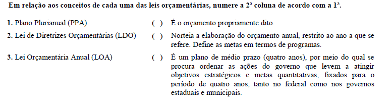 “O Orçamento público é o instrumento de gestão de maior relevância e provavelmente o mais antigo da administração pública. É um instrumento que os governos usam para organizar os seus recursos financeiros.” O art. 165 da Constituição Federal estabelece a existência de três tipos de leis orçamentárias: o Plano Plurianual (PPA), a Lei de Diretrizes Orçamentárias (LDO) e a Lei Orçamentária Anual (LOA).