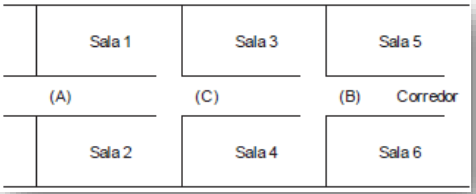 O técnico de informática do TRT da 13ª Região deve instalar e configurar um novo Access Point padrão 802.11g, identificado pela letra (C), em um corredor que já possui instalados dois Access Points padrão 802.11g, identificados pelas letras (A) e (B), para melhorar a qualidade do sinal para as salas 3 e 4, conforme a figura abaixo.
