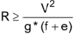 R = raio da curva; f = coeficiente do fator de atrito; V = Velocidade; e = coeficiente de superelevação; g = força da gravidade (9,8 m/s²)
