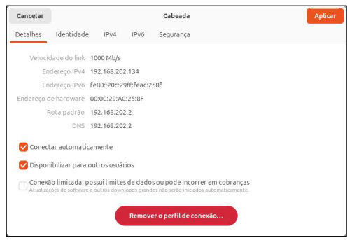 Considere um profissional de TI realizando uma manutenção em um computador com o Ubuntu Desktop 24.04. Em determinado momento, ele abre a tela de configurações da rede do dispositivo, conforme ilustrado a seguir: