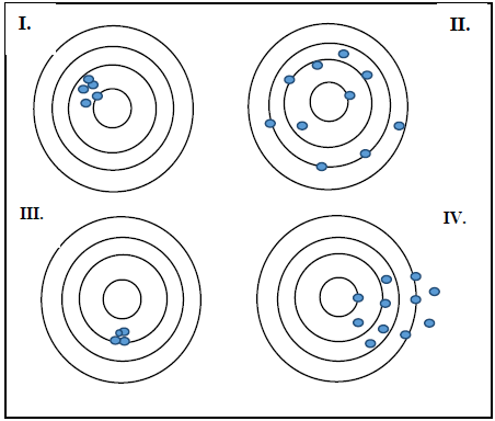 A análise de dados epidemiológicos é uma importante etapa da pesquisa, que deve exigir conhecimentos mínimos de estatística e de epidemiologia. A presença do “erro” nas pesquisas é refletida nos termos validade e precisão. Conforme esquema a seguir, sobre conceitos de validade e precisão, analise os seguintes itens e faça a correlação: