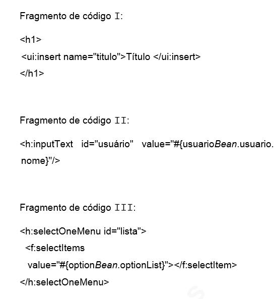 Para criar as páginas XHTML de uma aplicação JSF é possível utilizar um conjunto de bibliotecas de tags JSF. Algumas dessas bibliotecas são HTML, Core e Facelets. Considere os fragmentos de códigos abaixo, que utilizam tags dessas bibliotecas:
